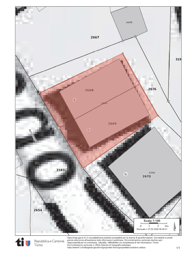 Particella nr. 2649; Edificio 165 m2; edificio 55 m2; Terreno 1’700 m2
